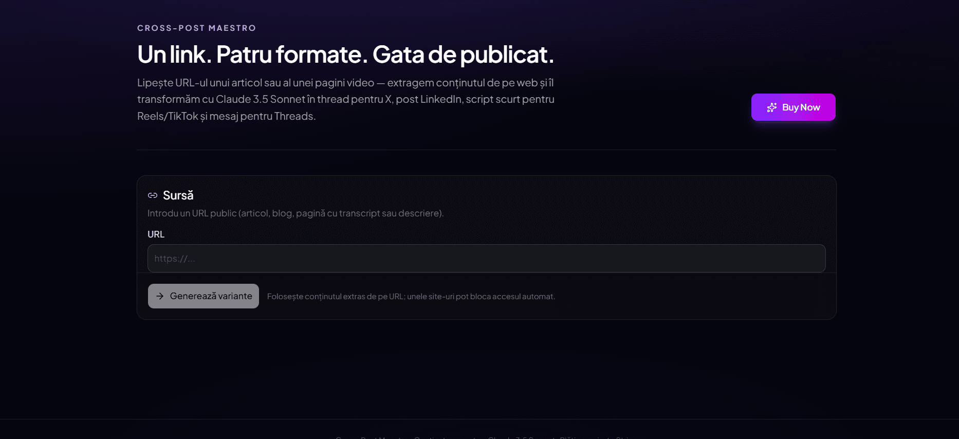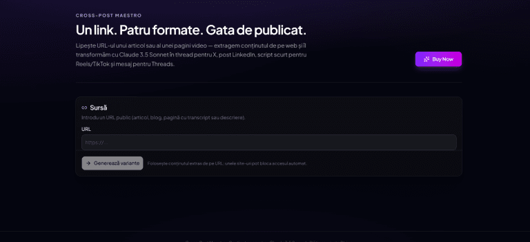 Ai un articol sau o pagină video și vrei variante gata de publicat pe toate platformele? Cross-Post Maestro e o aplicație web Next.js + Tailwind + shadcn/ui: lipești un URL, aplicația extrage conținutul de pe web și generează cu Claude 3.5 Sonnet: