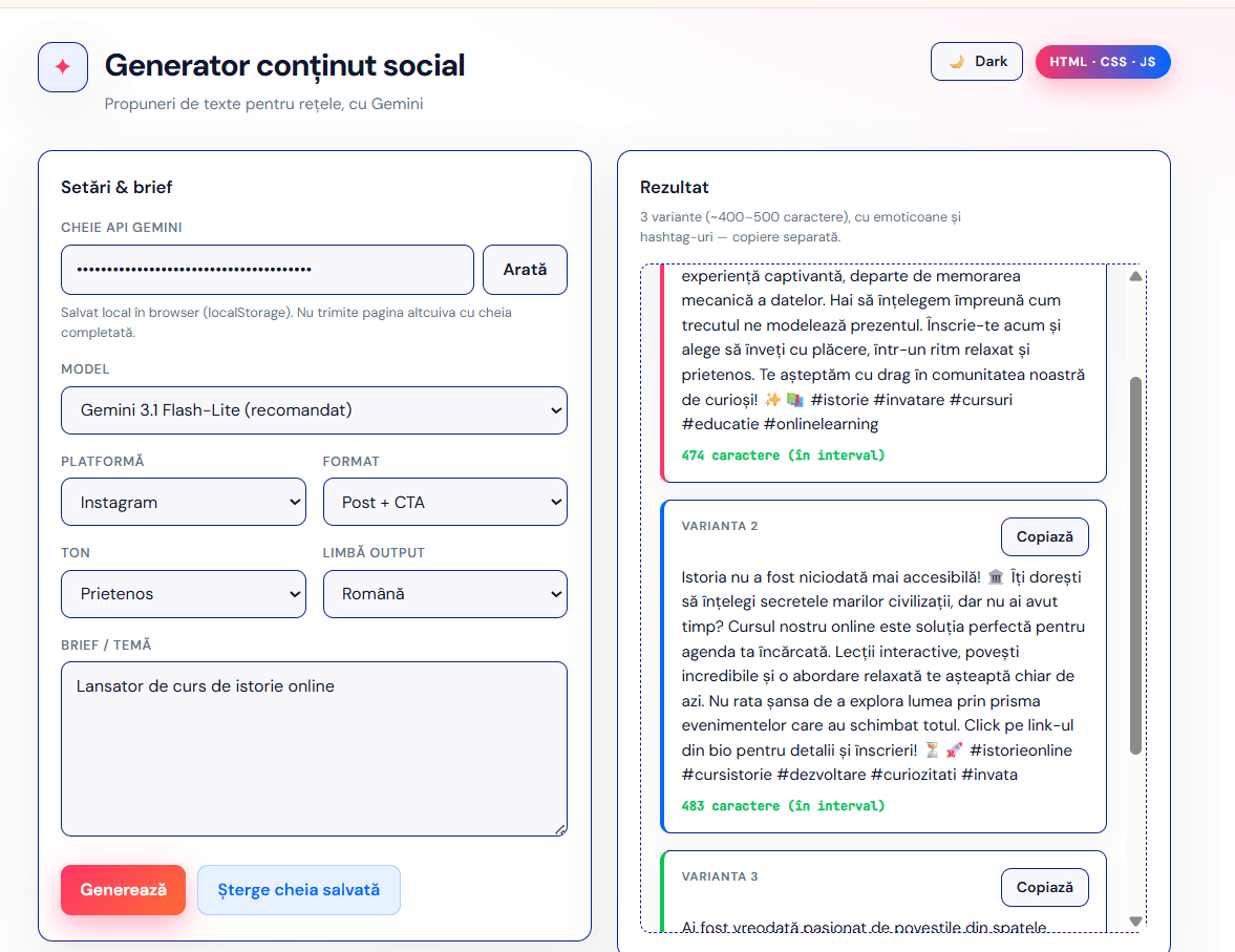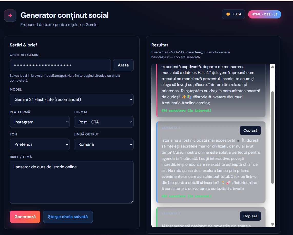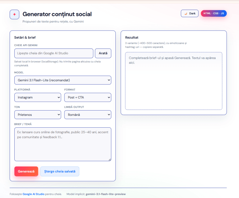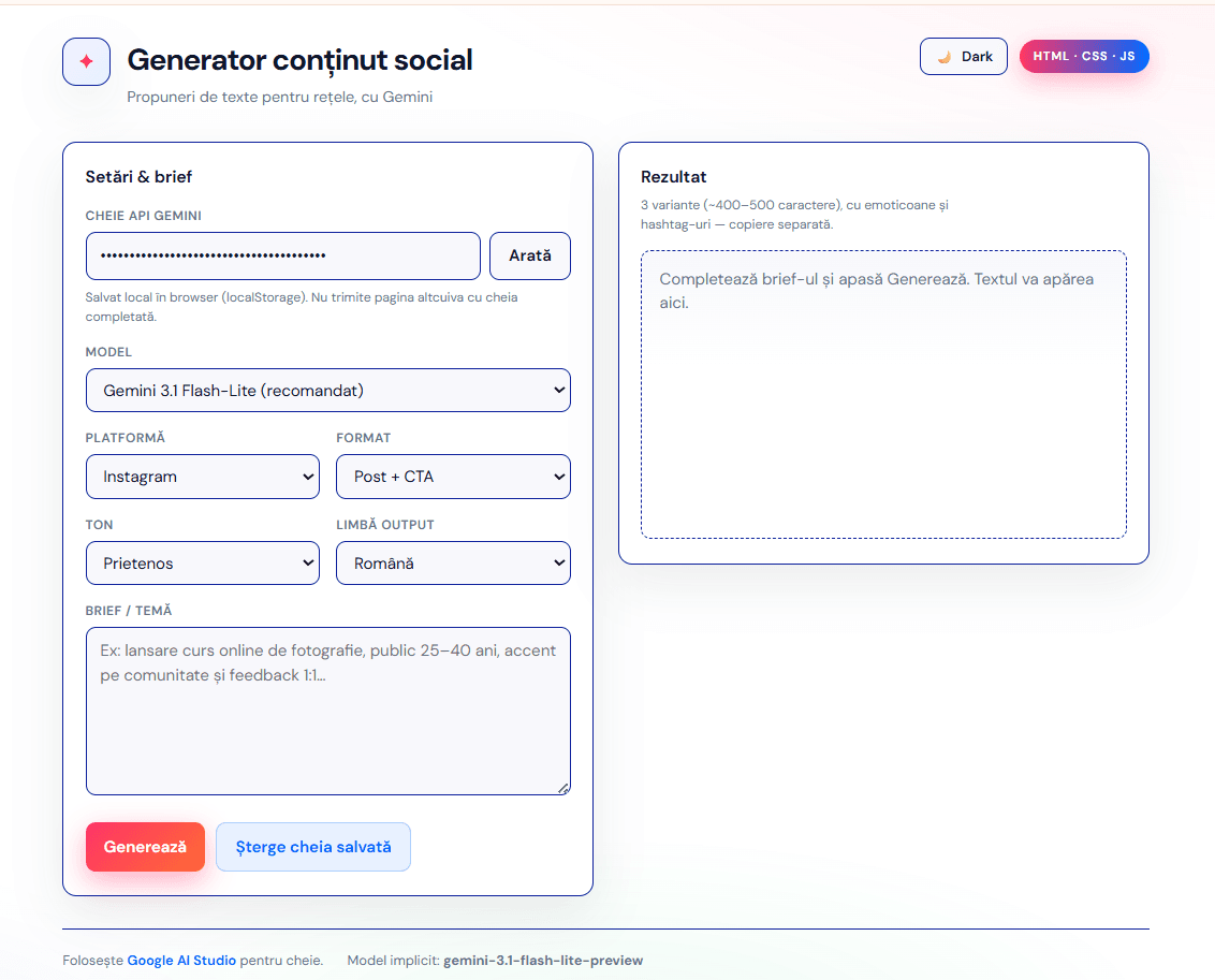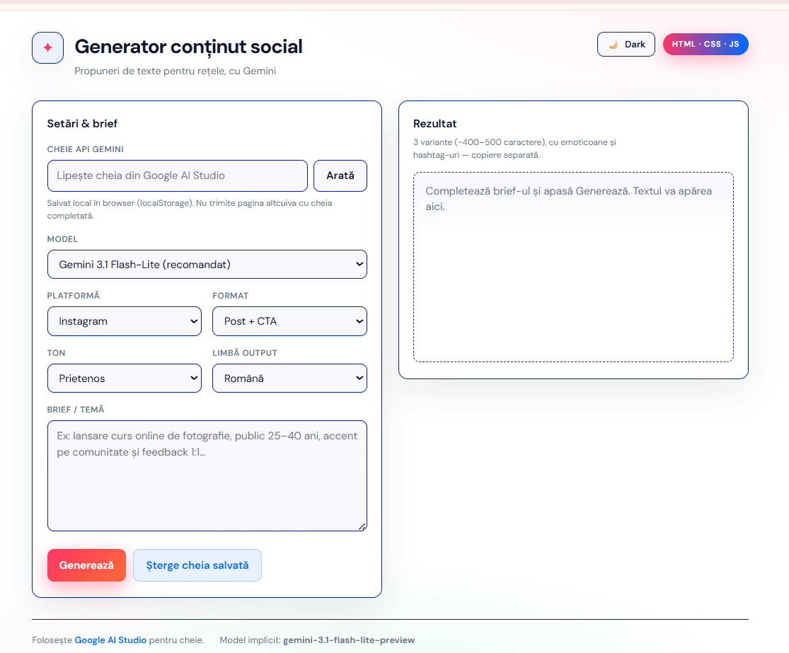 Acest pachet este o mini-aplicație web 100% HTML, CSS și JavaScript: deschizi index.html și generezi conținut cu Google Gemini (modele Gemini 3.1 Flash-Lite sau Gemini 3 Flash, la alegere).